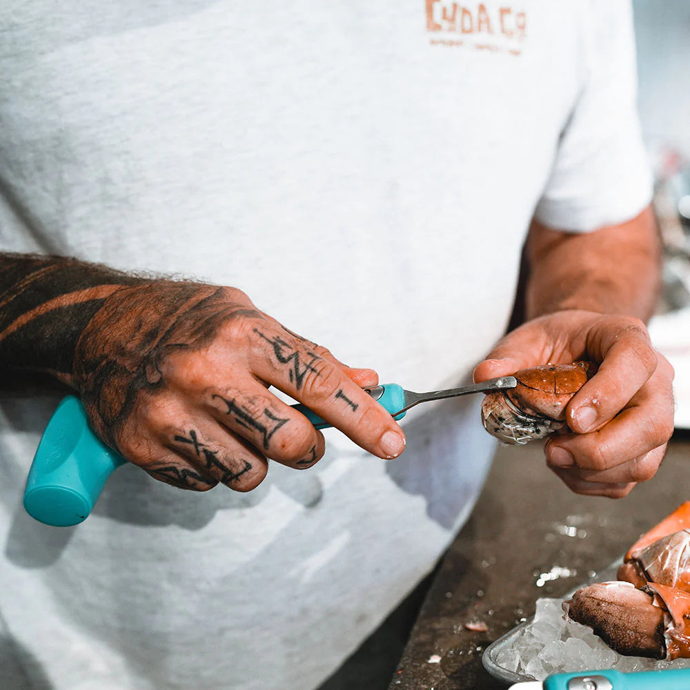 This innovative crab mallet combines 2 convenient tools into 1, with a two-sided hammer, and seafood spoon/pick. Hammer open larger claws then with the push of a button easily unfold the seafood pick to reach hard to get claw or leg meat. This lightweight versatile design is ideal for blue, snow, dungeness, stone crabs, and lobster.