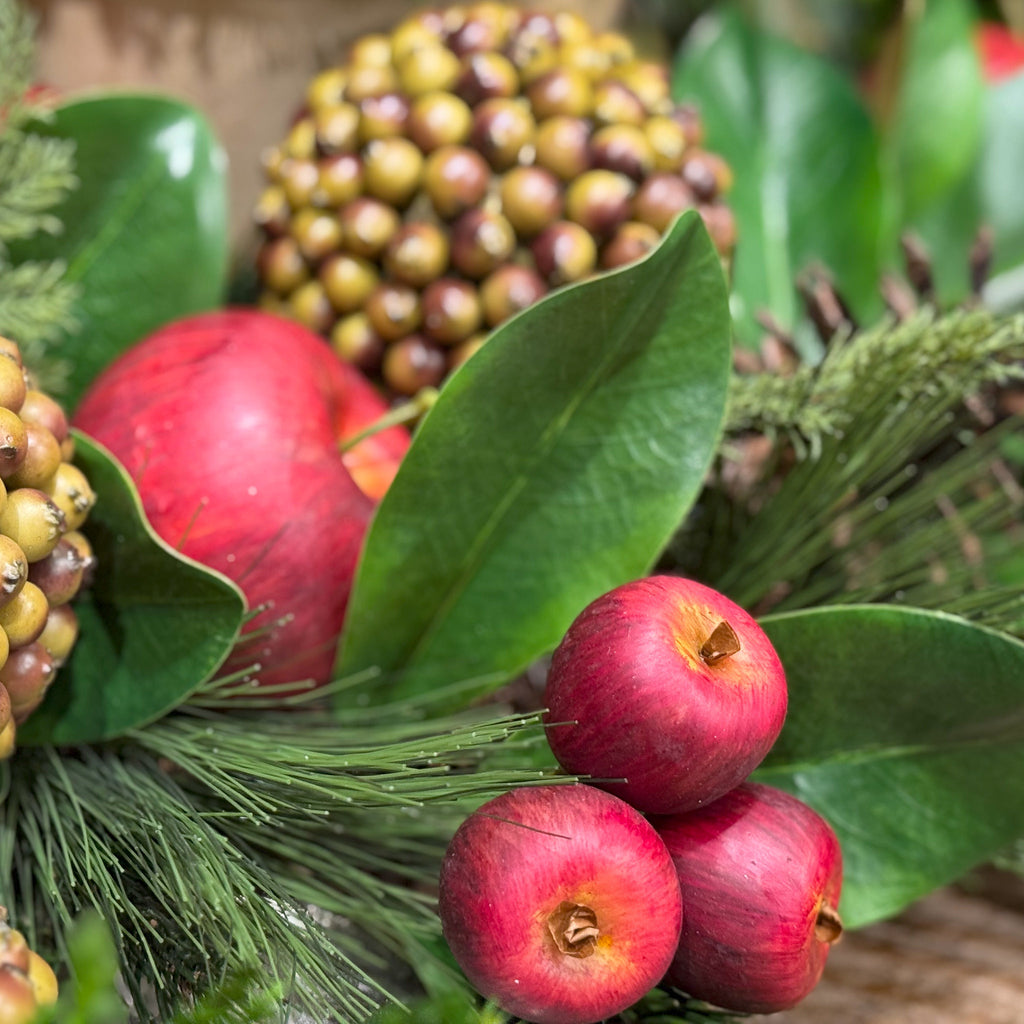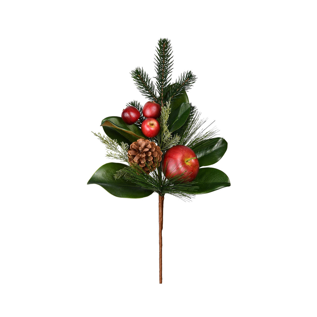 Celebrate the season with this 19-inch Magnolia and Apple Pick, a festive blend of lifelike greenery and vibrant accents. Featuring faux magnolia leaves, red apples and berries, layered pine sprigs, and a natural pinecone, this pick brings rich texture and classic holiday charm to any display. Ideal for wreaths, centerpieces, or seasonal arrangements, it adds a full, fresh look with a warm, wintry feel.