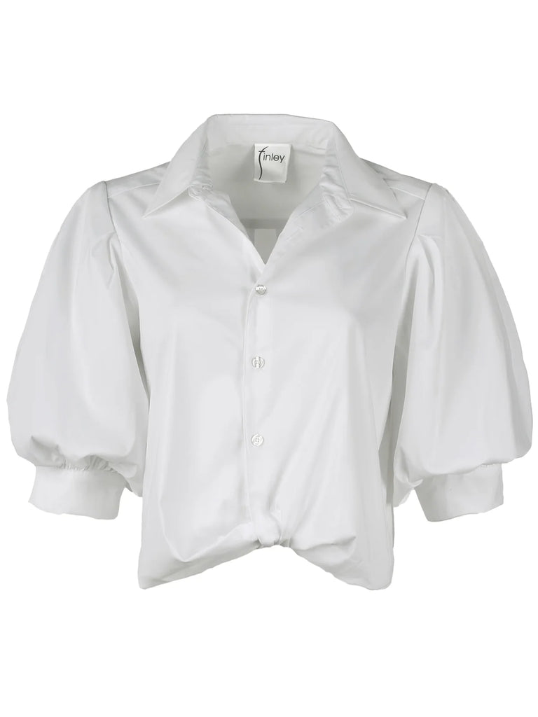 - Finley "Bomba" white silky poplin shirt features a front twist at the hem