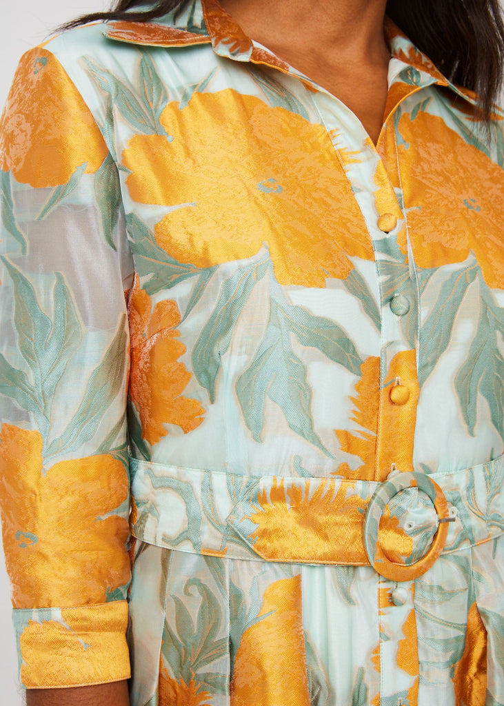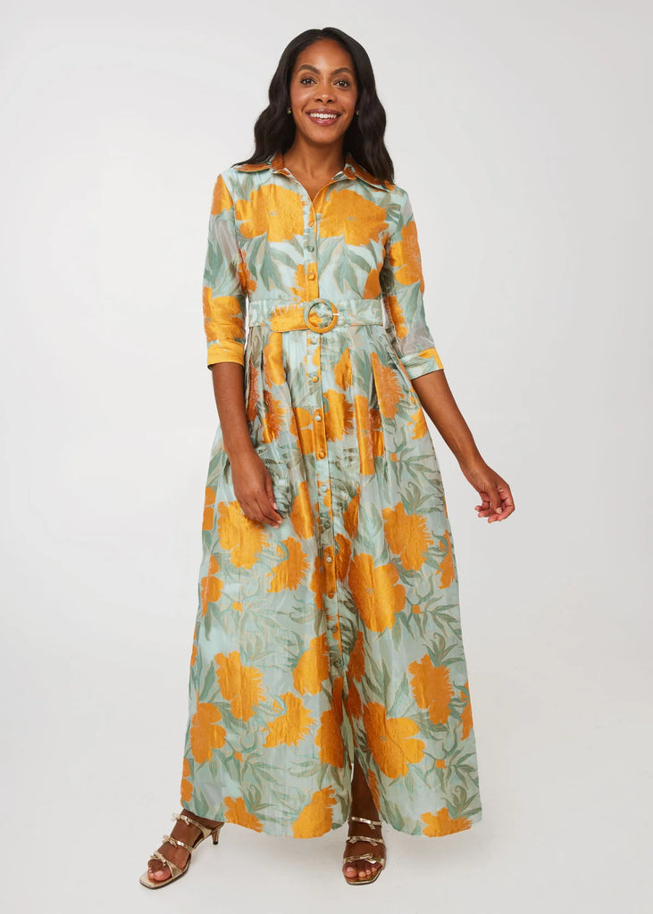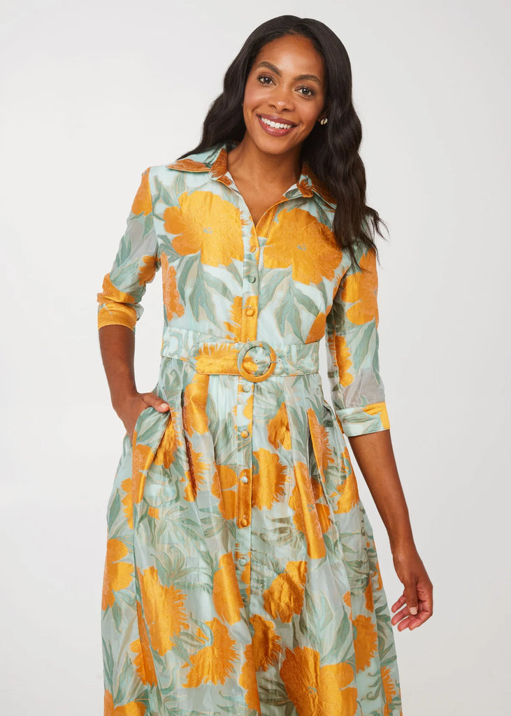 Inspired by our best-selling Charlotte silhouette, the Cecilia Gown is the epitome of refined elegance. With its structured collar, quarter-length sleeves, button-up front, and buckle belt, this full-length gown offers graceful coverage with timeless appeal. Whether you're the mother of the bride or groom or attending a black-tie affair, the Cecilia ensures you feel polished and poised for life’s most meaningful moments. Rendered in a soft mint and orange pansy vine organza, it brings a fresh yet classic feel to formal dressing.