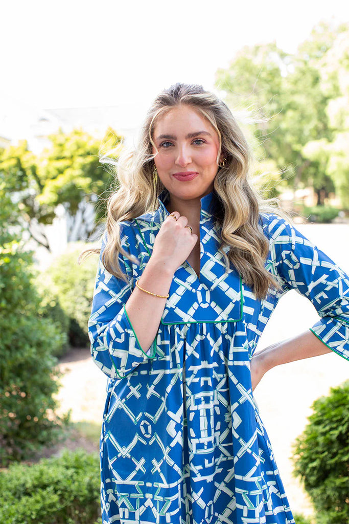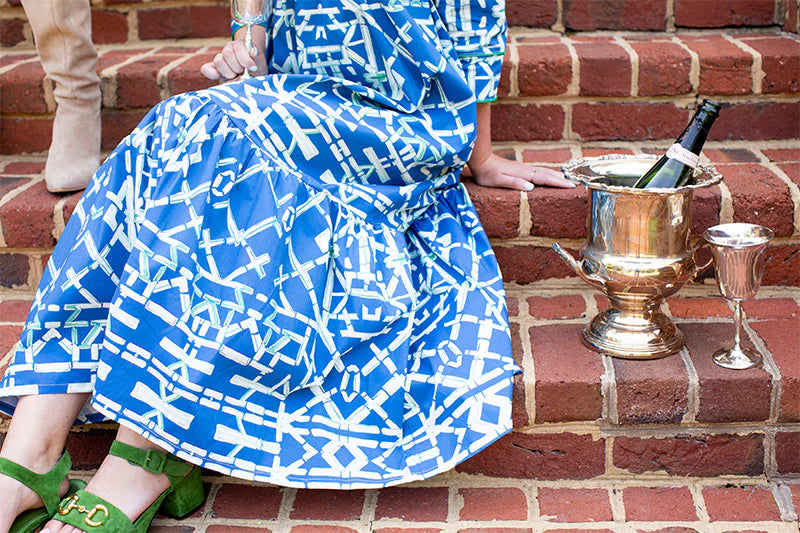 With a beautiful base of French blue and our classic trellis design, it is easy country estate living in a dress.