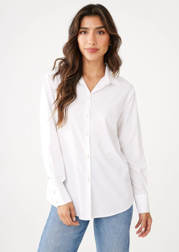 A chic basic that is not so basic. The Nora blouse is crafted of soft cotton poplin making it a perfect professional and playful choice. Embrace comfort, versatility, and style by paring back to your favorite pants for everyday wear or our Olivia Skirt for a dressy event.